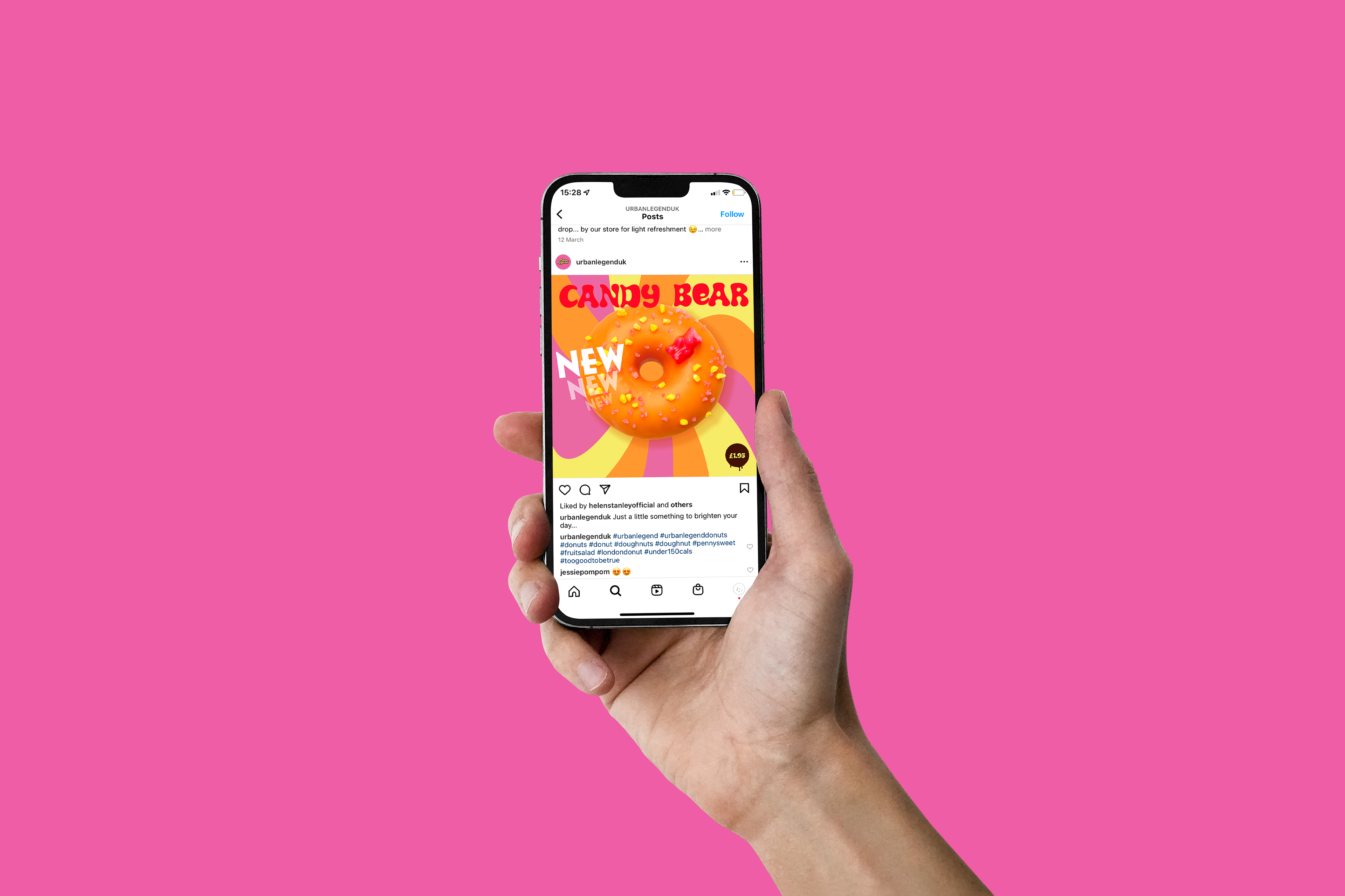 Urban Legends are a next generation doughnut company with a 'candy industrial' style. The brief required promotional assets for a new product launch called 'Candy Bear'. Required assets included a website billboard, a square instagram post, and a large scale poster, to advertise the doughnut and convince people the next best thing they can do is grab themselves a doughnut.
